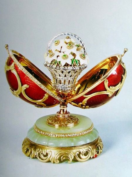 Spring Flowers Egg - quả trứng phục sinh Hoa mùa xuân được làm bằng vàng nhiều màu ,bạch kim, được tráng men màu đỏ dâu tây trong mờ trên nền guilloche và được phủ bằng các cuộn và tán lá vàng theo phong cách tân rococo. Quả trứng hoa mùa xuân mở ra dọc theo một đường may đính kim cương dọc được buộc chặt ở trên cùng bằng một móc cài kim cương, để lộ ra một bộ kim cương có thể tháo rời giỏ thu nhỏ bằng bạch kim gồm cỏ chân ngỗng, những bông hoa có cánh hoa bằng đá chalcedony và nhụy hoa đính đá Demantoid