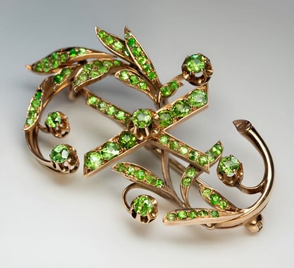 Một chiếc trâm cổ trang nhã bằng vàng 14K được thiết kế dưới dạng chữ số La Mã mười 'X' đan xen với một nhánh hoa theo trường phái Art Nouveau. Chiếc trâm được tô điểm bằng những viên Demantoids màu xanh lá cây sặc sỡ của Nga.